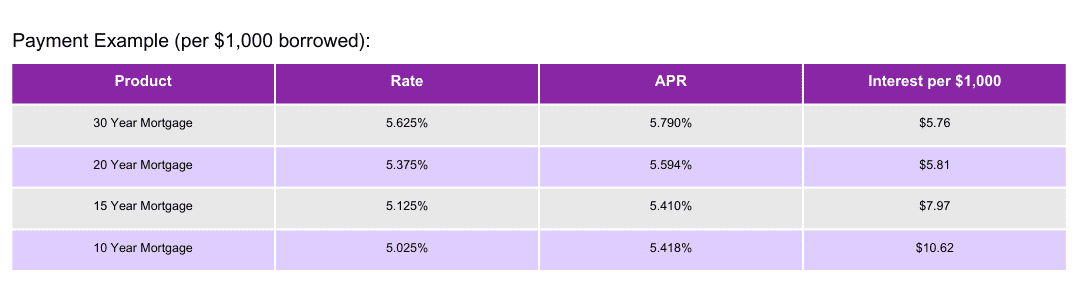 All rates subject to change without notice. Rates based on your credit bureau score. The rates listed above are for members who have excellent credit. Rates increase if there have been previous credit problems and for other applicable loan level price adjustments. All rates quoted “as low as”. APR = Annual Percentage Rate. The payment example does not include taxes or insurance and the actual payment obligation may be greater.