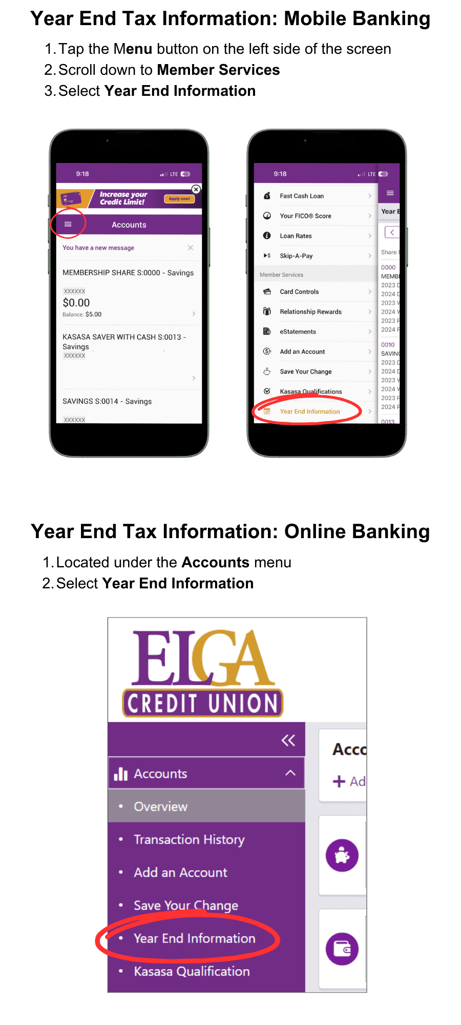 Transaction activity is available by viewing account history in online or mobile banking. Year to Date totals for tax related items like interest and dividends received, interest paid, and IRA / HSA contributions are available by clicking Year End Information located on the menu tab in online and mobile banking.